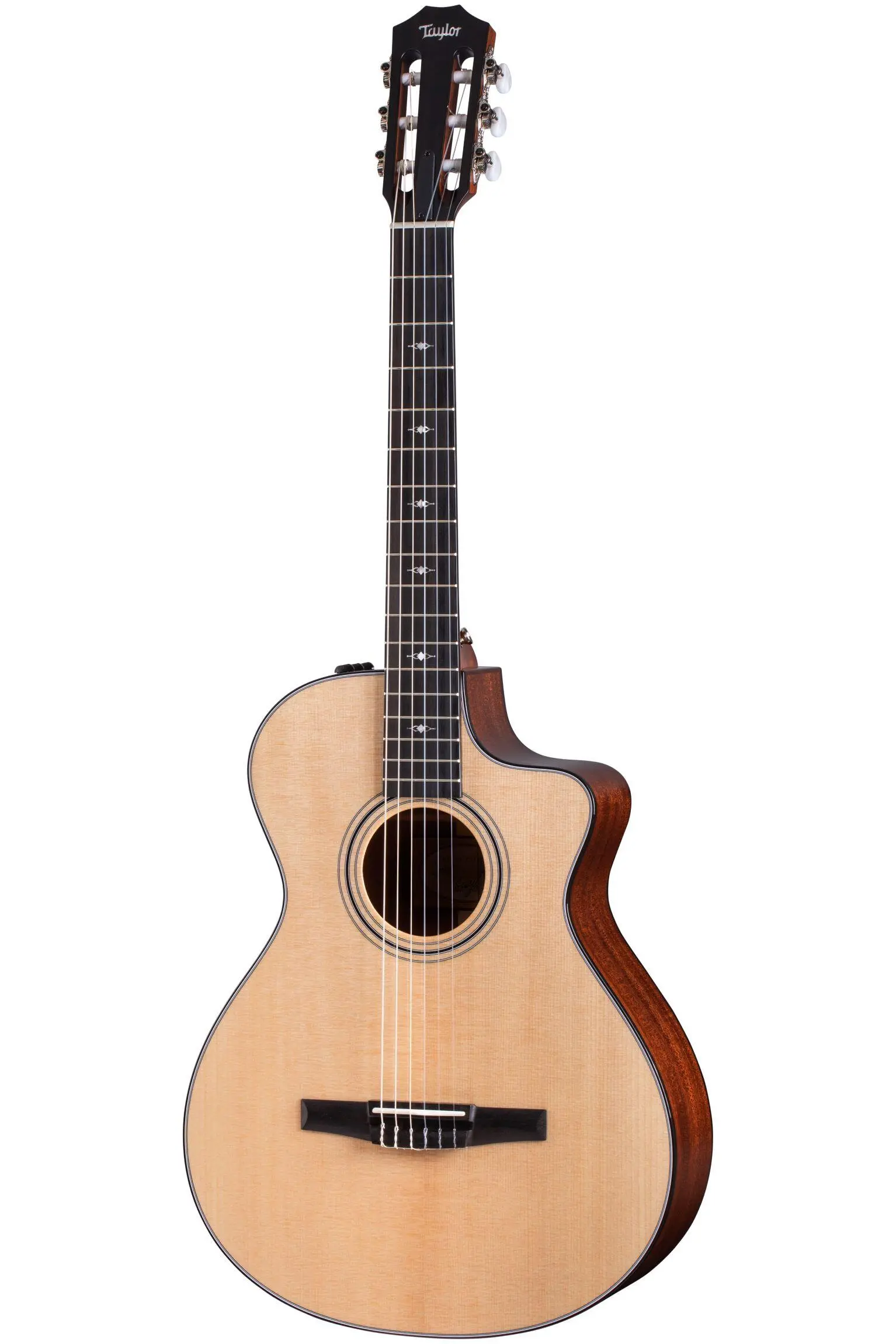 Taylor erweitert sein Nylon-Sortiment und bietet hier die 300er Serie komplett in Massivholz mit einem neuen Soft Cutaway an.