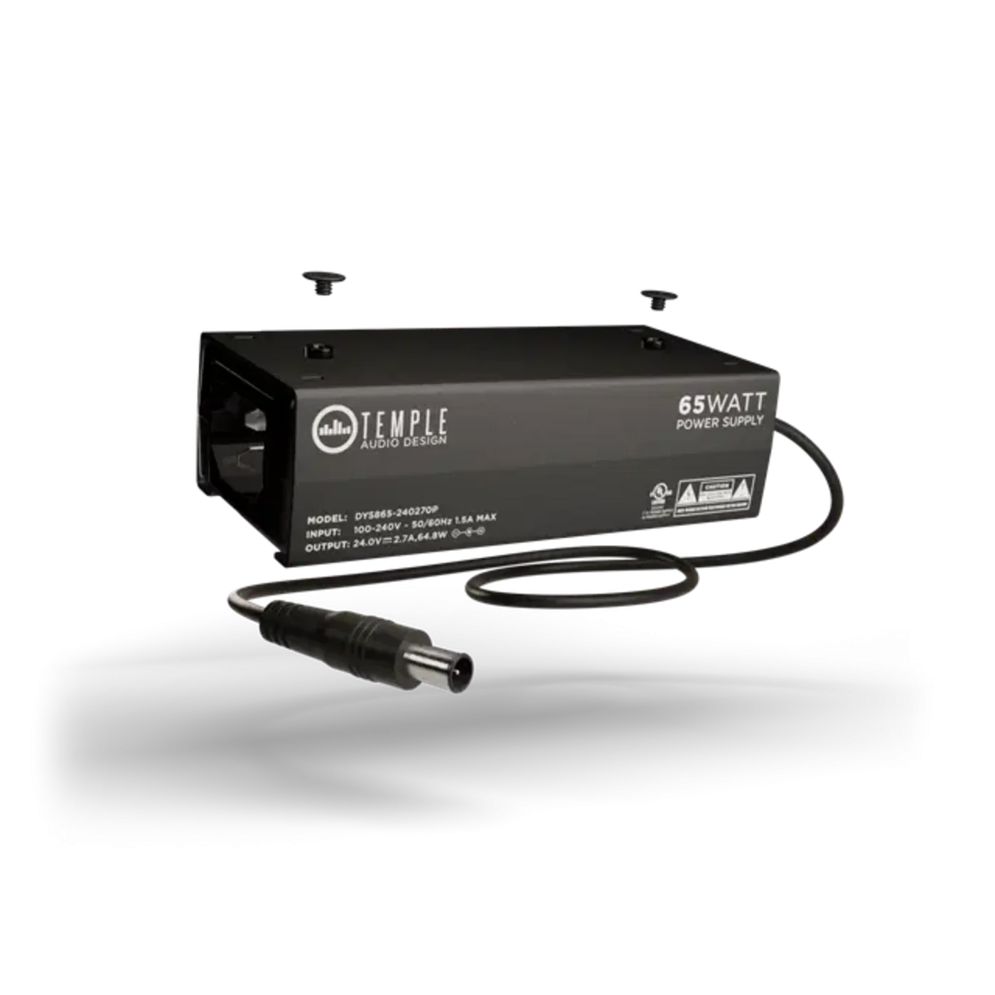 Flat mounting screws offer different positioning options for your top-mounted pedals. Power supply 65 W, 24 V DC 2.7 A, 100-240 V at 50/60 Hz, 1.5 A max. 24V EIAJ-3 connector: compatible with Temple Audio Hi5 MOD and third-party brands using the same system (e.g. Strymon, Walrus). Attaches directly to the perforated surface or mounting bracket using the screws supplied.