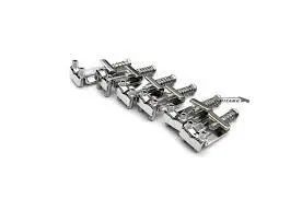 3mm Vintage is a set of 6 pressed steel bridges, nickel finish, 11.3 mm center-to-center spacing (≈ 56.5 mm), perfectly matched to vintage Strat/Tele tremolos (6 screws) .