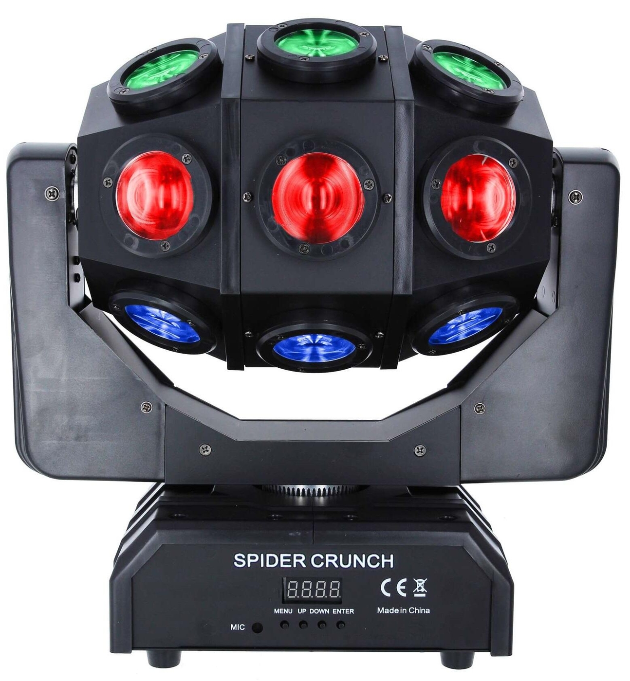 The Spider Crunch is an LED lyre made up of a rotating roller with 6 rows of 3 x 10W RGBW LEDs (18 LEDs in total).