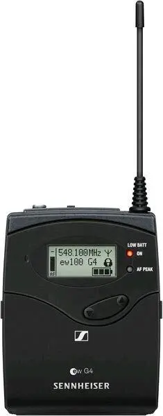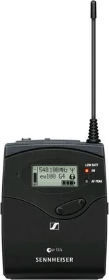 The Sennheiser SK 100G4-A1 is a bodypack transmitter (supplied without microphone) for connecting a lavalier or headband microphone.