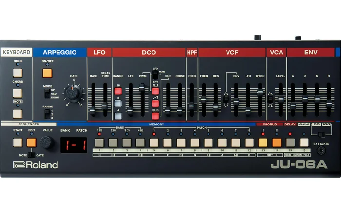 The JUNO-106 filter was probably preferred, but the JUNO-60 lacked the arpeggiator function. The JU-06A includes these two functions, with the addition of a sequencer and chord memory. The sequences created with the chord memory produce polyphonic phrases so rich that we often forget that they come from an instrument that fits in a backpack.