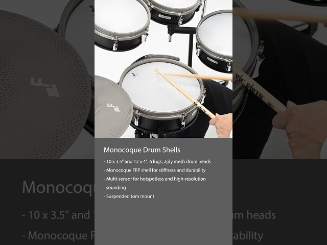Le module sonore compact intègre le processeur ELISE™, garantissant une détection précise et une latence minimale. Les sons stéréo ont été enregistrés par EFNOTE, sans resynthèse, pour reproduire fidèlement le comportement des batteries et cymbales acoustiques.