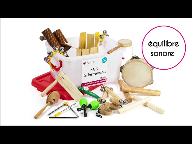Composition de la malle : 2 poignées de grelots, 1 paire de claves Acacia L. 18 cm, 1 paire de claves Pao rose 14 cm, 1 tube résonant Pao rose 2 tons, 1 tambourin peau naturelle avec cymbalettes Ø 15 cm, 1 octo-block, 1 crécelle, 1 paire d'oeufs sonores maracas, 1 triangle 13 cm, 2 bracelets de 5 grelots, 1 paire de castagnettes à doigts, 1 castagnette à manche, 1 kazoo, 1 tam-tam