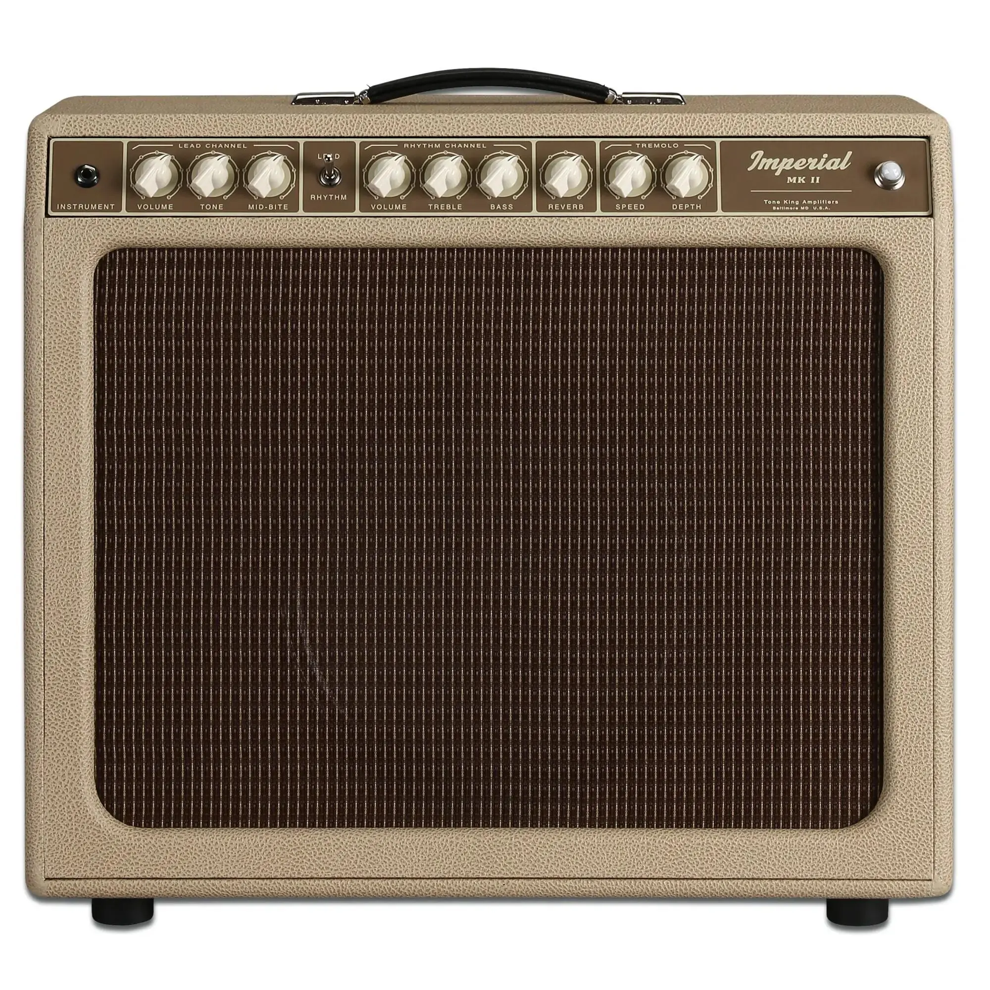 Bien qu'étiquetés Rhythm et Lead, les deux canaux commutables au pied de l'Imperial MKII pourraient très bien être appelés Blackface et Tweed. Le canal Rhythm, plus puissant, offre le corps et la présence cristallins des amplis les plus populaires du milieu des années 60. Le canal Lead apporte la réponse spongieuse des médiums et le sustain des modèles des années 50. Les deux canaux sont dotés de commandes d'ajustement de la tonalité simples, pour une tonalité impressionnante sur n'importe quel réglage.