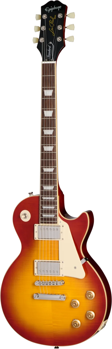 L’Epiphone Les Paul Standard 50s Figured en finition Washed Cherry Sunburst rend hommage aux mythiques Les Paul des années 50, célèbres pour leur esthétique intemporelle, leur confort de jeu et leur signature sonore incomparable.