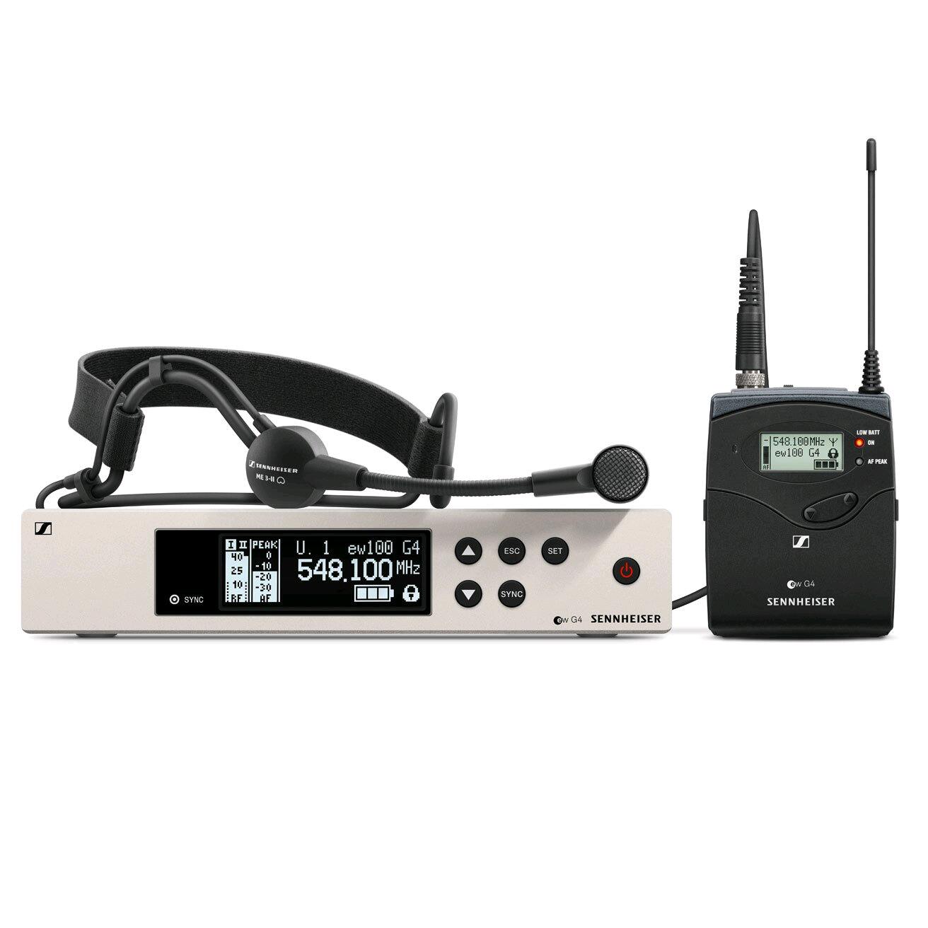 Le Sennheiser EW 100 G4-ME3-A est un système sans fil composé d'un micro serre-tête ME 3-II cardioïde à condensateur, un émetteur de poche SK 100 G4 et d'un récepteur EM 100 G4.