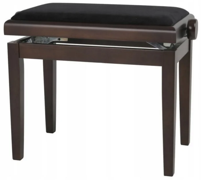 Très bon rapport qualité prix pour cette banquette en noyer avec un dessus en skai marron conçue spécialement pour les pianistes.
