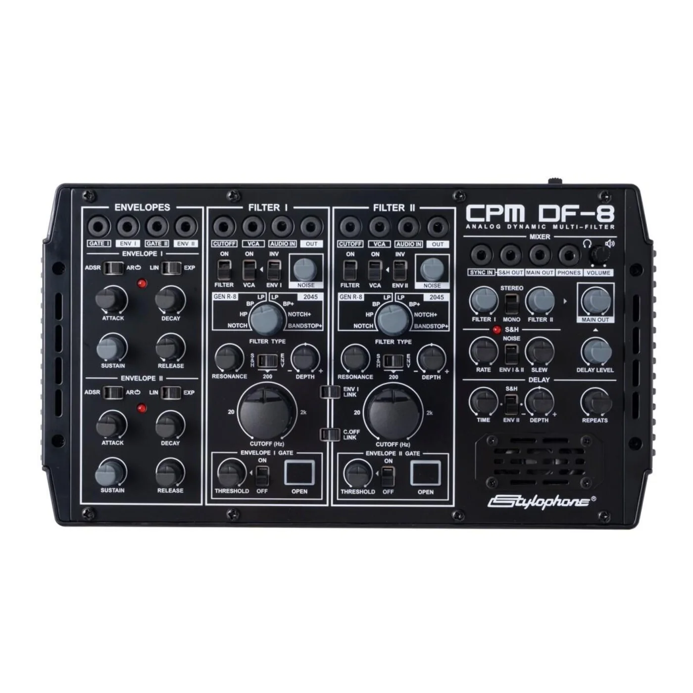 Avec deux canaux et huit types de filtres incluant le passe-bas, passe-bande, passe-haut, notch et trois modes hybrides : (Bandpass +, Notch+, Bandstop +), le Stylophone CPM DF-8 offre une vaste palette sonore, des balayages doux à la distorsion la plus mordante.